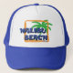 Orange art frame around green palm tree, bold blue Malibu Beach text, an unusual design that's a true original not found in malls or boardwalks. Southern California lifestyle on a stylish and practical hat / cap! Malibu Beach in ocean deep blue text, grassy green palm tree behind sunshine orange contemporary artistic frame. Another original from Malibu Tees!
