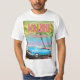 Malibu California vintage travel poster of a classic old car by a beautiful beach.