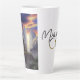 Tall latte mug with MalkieriCon logo and painting of The Golden Crane Flies.