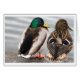 A photograph of two mallard ducks sitting on the quay, both staring intently at something on their right. The male duck on the left shows off his beautiful coloured head but the little female on the right wins in the beauty stakes with her stunning plumage, with a fantastic view of the detail on her wing and tail feathers. The birds were photographed at Hogganfield Loch Nature Reserve in Glasgow, Scotland.