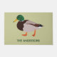 Welcome guests to your home in style with this personalised doormat. It features a realistic style illustration of a male mallard duck in green and brown set against a pale green background with a name or other text in coordinating green lettering.