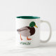 Create a personalised gift that's perfect for bird lovers when you add their name to this coffee mug. It features a realistic style illustration of a male mallard duck in green and brown with a name or other text in coordinating green lettering. The graphic and text appear on both sides of this mug.