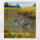 Male and female mallard ducks in flight over a golden pond, water rippling to reflect the colours of the background autumn foliage glowing in the sunlight. Realistic artwork created from an original oil painting by wildlife artist Crista S. Forest.