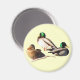 Three mallard ducks are sitting on this magnet. The two males have iridescent green heads, mostly white bodies and yellow beaks. The female's feathers are shades of brown and gold and her beak is orange.