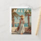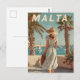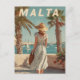 This charming vintage poster features a stylish woman in a classic 1950s dress strolling along a sunny promenade in Malta. Behind her, the Mediterranean sparkles and traditional Maltese architecture lines the waterfront. Soft retro textures and warm tones evoke the timeless elegance of mid-century coastal life on the island. A perfect piece for fans of vintage fashion, seaside charm, and nostalgic European travel art.
