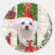 Maltese Dog Christmas sitting outside decorated home with Christmas wreath, Christmas tree is a perfect Christmas gift idea for dog lovers.