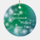 On the front of this Holiday ornament is a watercolor image of a little white Maltese dog wearing a bright red Santa Claus hat. The image is stands out against a gradient green and blue bokeh background. The back of the ornament has the same background with custom white text that currently says "Merry Christmas Happy New Year". Cute for anyone, even if you are not "owned" by a Maltese!