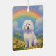 A personalised Maltese memorial ornament with a painting of a happy Maltese on an idyllic heavenly hill with a beautiful rainbow overhead. Symbolising the Maltese has passed the rainbow bridge to doggy heaven. Personalise it with your own Maltese dog's name (or any other text) on the back side of the ornament. Makes a wonderful memorial gift for any Maltese dog lover.