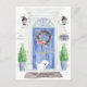 Announce your new address with our stylish announcement featuring a Maltese, blue front door, welcome mat, slate sign, topiaries and a floral wreath set on a grey brick background.