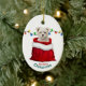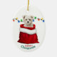 On the front of this Holiday ornament is an image of an adorable white Maltese puppy in a red and white Christmas gift bag. Behind the dog is a string of colorful Holiday lights. The text at the bottom says "Merry Christmas". The back of the ornament has the same image with a custom name field.