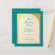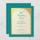A modern birthday invitation. On a teal blue rectangular background, it has a faux gold foil arch that has inside teal text on white background. The words Birthday Party are written in an elegant calligraphic script; the first line is arched text.