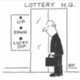 Funny cartoon of a man at an elevator at a Lottery Company Headquarters. The lift elevator buttons have a lucky-dip option.