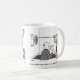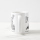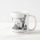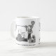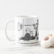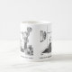 Dart player gift mug. Man is playing darts with extremely lengthy darts which reach the board without him releasing them. Gift for a dart player.