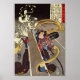 This poster is from a color print created by the famous Japanese artist Utagawa Kuniyoshi in the 19th century. It's titled: "A man confronted with an apparition of the Fox goddess". Many of Utagawa's prints were themed around ghosts, apparitions and specters. I'm not sure who the man in the print is, but he's probably a samurai (Japanese warrior). He's shielding his eyes with one hand while holding a long bow in the other. His kimono (clothes) are very colorful, and he's also draped in some kind of fur. Utagawa has signed the artwork (and perhaps written a few sentences) in Kanji characters and Hiragana (Japanese writing).