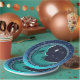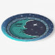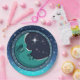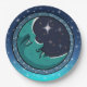 Blue crescent moon with the face of a sleeping man in a starry night sky. Part of his face is lit up by a bight white shining star. The design is set inside a blue circle border with small white and blue dots.