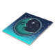 Blue crescent moon with the face of a sleeping man in a starry night sky. Part of his face is lit up by a bight white shining star. The design is set inside a blue circle border with small white and blue dots.