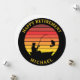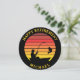 Silhouette of a man in a boat fishing and catching a big bass fish silhouetted against a retro style sunset. You can customise the colours and personalise the "Happy Retirement Michael" text with this template.