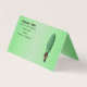 This fold over standing business card has a man with a big green pickle with a face for a head wearing a brown suit on a green background. Customise all your information on the front, back, and inside with the templates.