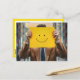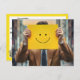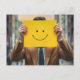 A man in business attire holds a square yellow paper with a smiling face drawn on it, obscuring his face, while standing on a city street