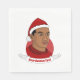 Paper napkins with illustration of a African American or Hispanic man with short black hair and red Santa Claus hat; in red circle on a white background, with customisable text template for your name or message