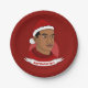 Paper plates with illustration of a African American or Hispanic man with short black hair and red Santa Claus hat; in red circle on a red background,  with customisable text template for your name or message
