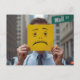 A man in business attire holds a square yellow paper with a worrisome face drawn on it, obscuring his face, while standing on Wall Street in New York City