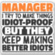 Funny Manager Sayings "Manager I Try To Make Things Idiot Proof But They Keep Making Better Idiots". Grab this Funny Manager design as a funny gifts for an awesome mum, dad or friend.