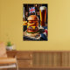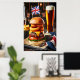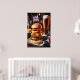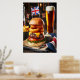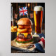 Indulge in a Manchester Munchies classic with this hearty British Pub-Style Burger. A thick Angus beef patty, grilled to juicy perfection, is topped with aged cheddar cheese, crispy onion rings, and a generous smear of H sauce, all stacked high on a toasted English muffin bun. A small British flag adds a touch of British charm, while a backdrop of a pint of ale completes this classic pub meal.
