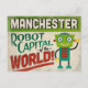 A funny Manchester New Hampshire vintage travel postcard featuring a friendly robot with fun retro style text that says, "Manchester, Robot Capital of the world!"