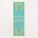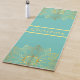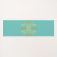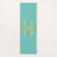A beautiful yoga or exercise mat featuring a hand-drawn mandala design in a gold tone over a light teal coloured background.