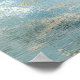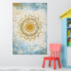 Style : Mélange de motifs géométriques dorés sur un fond texturé bleu et blanc.