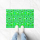 Doormat in a twelve point mandala pattern in shades of deep emerald to pale mint green with peacock, turquoise blue, and white accents