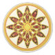 Twelve point mandala pattern in shades of chocolate brown, mustard gold, and dark brown on white, with a gold background