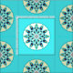 Twelve point mandala pattern in shades of turquoise, tan, navy, beige and grey on a turquoise background