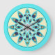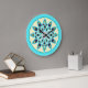 Twelve point mandala pattern in shades of turquoise, tan, navy, beige and grey on a turquoise background