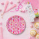 Twelve point mandala pattern in shades of fuchsia pink, peach and coral, outlined and accented with white