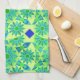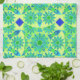 Kitchen towel in a twelve point mandala pattern in turquoise, blue, and shades of lime green accented with royal blue