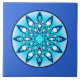 Twelve point mandala pattern tile in shades of pale blue, cobalt / navy and white on a cobalt blue background