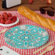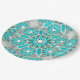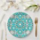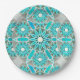 Twelve point mandala pattern in turquoise, blue, white, and shades of grey / grey on a pale, silver grey background