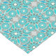 Table runner in a twelve point mandala pattern in turquoise, blue, white, and shades of grey / grey on a pale, silver grey background