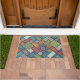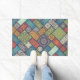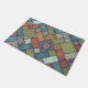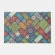 Graphic of assorted mandalas within square and rectangular shapes in a tiled design, warm muted colours, seamless repeat pattern
