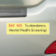This bumper sticker will hopefully get people asking why should I say no to mandatory mental health screening. One reason is because any law passed in this regard would mean the end of freedoms...freedom of speech and freedom of thought. Display this bumper sticker before the issue becomes dire.