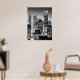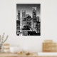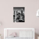 Poster in a semi abstract illustration of mid-town Manhattan in black and white, illuminated with city lights, under a starry midnight sky