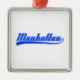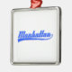 Manhattan, New York City, written with a swash (tail). Fonts in white and blue. Original text design.