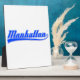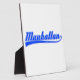 Manhattan, New York City, written with a swash (tail). Fonts in white and blue. Original text design.