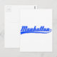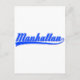 Manhattan, New York City, written with a swash (tail). Fonts in white and blue. Original text design.