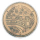 This manhole cover depicts an oriental scene with a cherry blossom tree, curved bridge and pagoda style lamps. Done in brass. Very ornate.