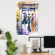 Poster of three elegantly dressed female figures wearing fashionable dresses and wide-brimmed hats. The setting appears to be a chic location, with architectural elements and soft, vivid background colours.