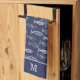 A pattern of white and light blue line fish drawings on a navy blue background makes this kitchen towel unique! The images are placed on a dark blue background, and a matching border at the bottom holds your monogram or other text.