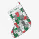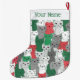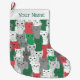 Many Green and Red Cats Design Large Christmas Stocking with customisable personalisation on front and back.